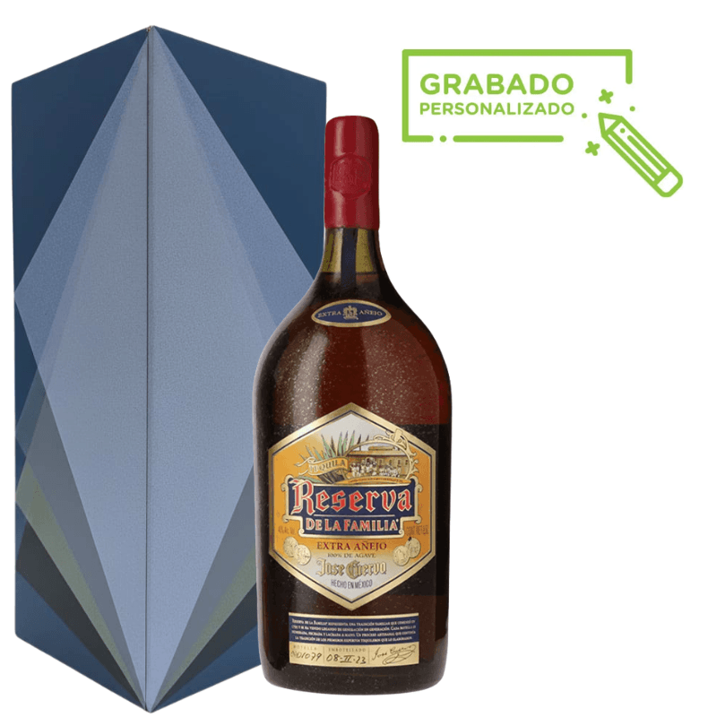 Tequila Reserva de la Familia Extra Añejo 2019 es una edición especial y de colección elaborada por Casa Cuervo, reconocida por su tradición y excelencia en la producción de tequila. Esta versión de 1.75 litros presenta una botella grabada artesanalmente, característica distintiva de la línea, que celebra el arte mexicano y resalta la exclusividad del contenido.